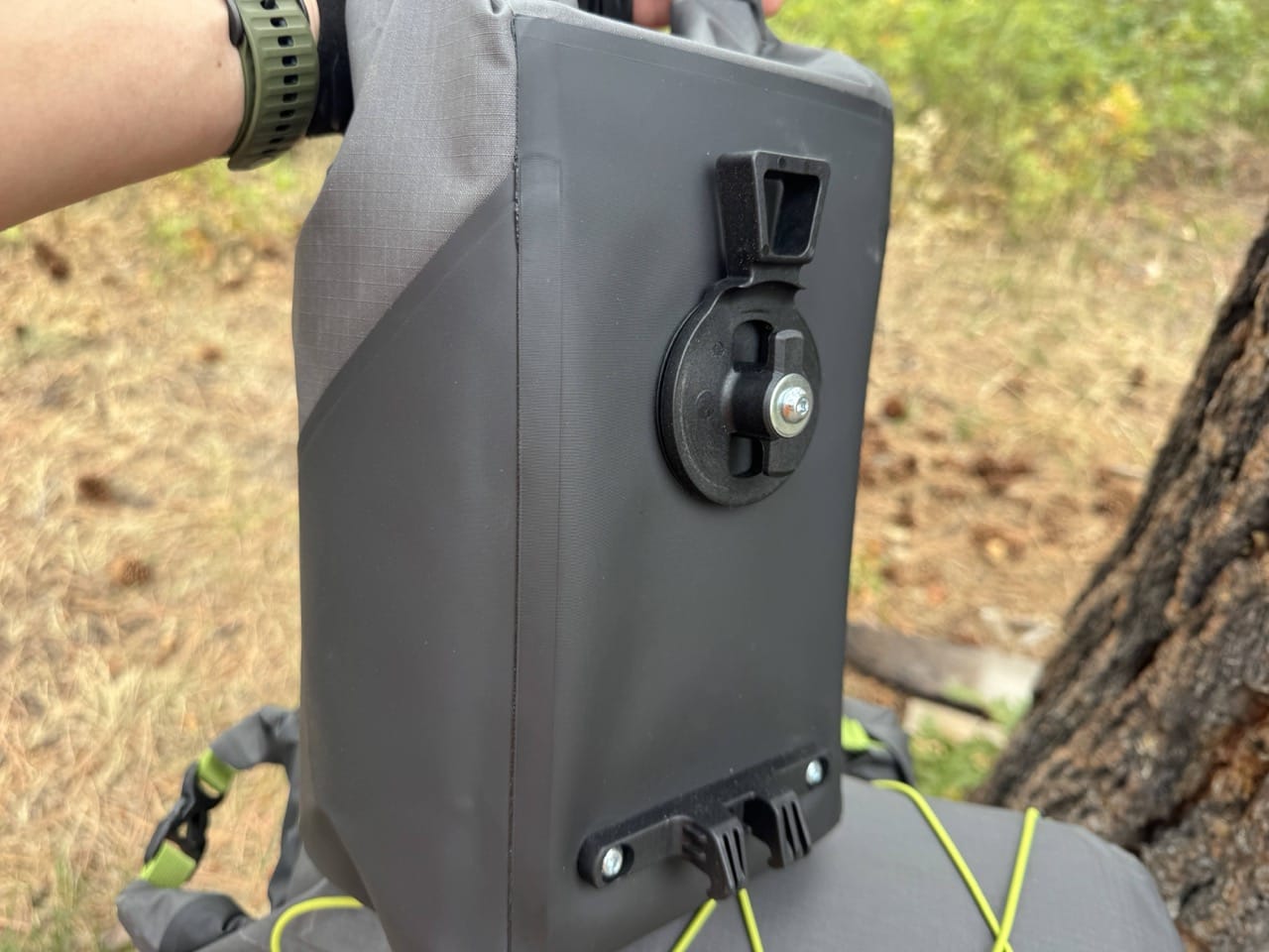 The mechanism is rather simple. It starts with the large QR lever that gets inserted into the cage and then turned to create a secure lock to the cage. This is further reinforced on the inside of the bag which uses a rigid plate to help keep your load stable and attached to the cage. In our testing on miles of rough single and doubletrack, the bags have not moved.